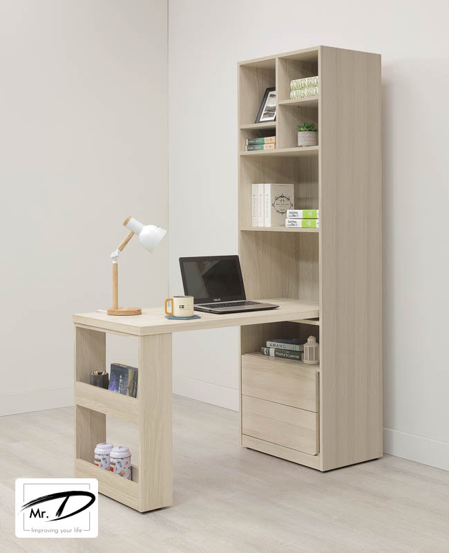 書櫃:寬60×深40×高195cm L桌:寬120×深55×高76cm 1. 採全環保木心板包含抽牆, 經立體木紋耐磨塗裝 2. 抽屜飾條石紋美耐皿耐磨材質, 採無把手設計 3. 側板與抽面採圓弧設計 4. 採三節式全拉鋼珠滑軌 5. 台灣製造