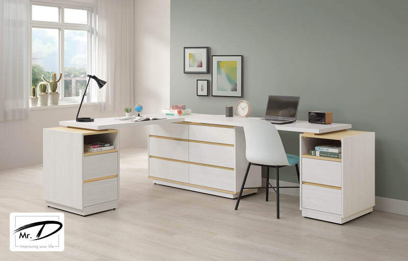 整組:寬210×深150×高75cm 二抽L桌:寬150×深55×高75cm 六抽側櫃:寬120×深40×高70cm 1. 採全A級環保木心板包含抽牆, 經立體木紋耐磨塗裝 2. 採系統式1.0mmABS厚封邊處理 3. 採斜邊無把手設計 4. 台灣製造
