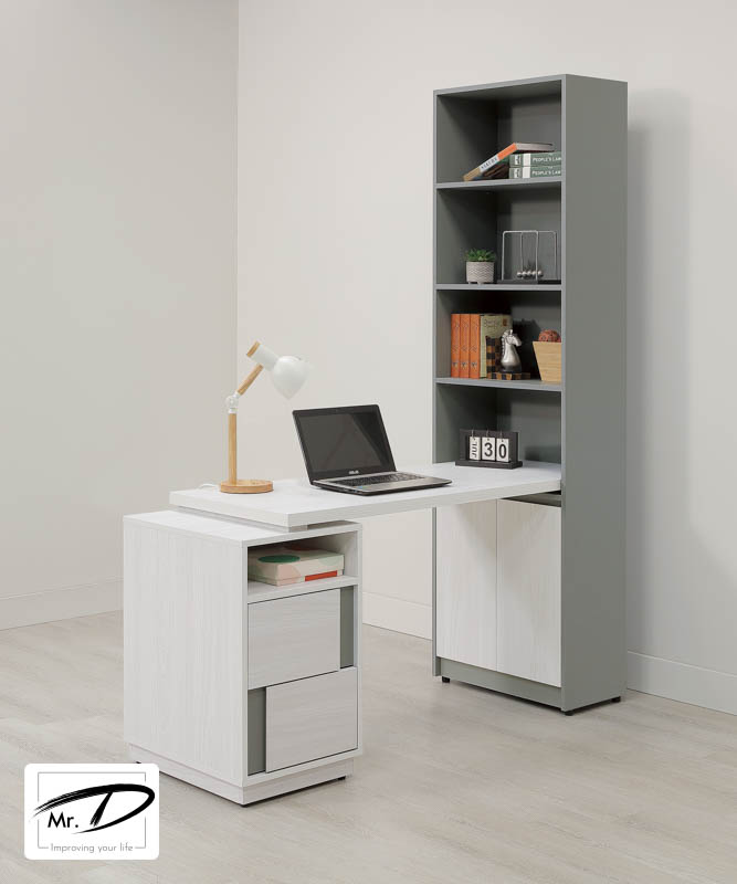 書櫃:寬58.5×深30×高202cm L桌:寬120~150×深54×高75cm 1. 採全A級環保木心板包含抽牆, 經立體木紋耐磨塗裝 2. 採系統式1.0mmABS厚封邊處理 3. 採斜邊無把手設計 4. 台灣製造