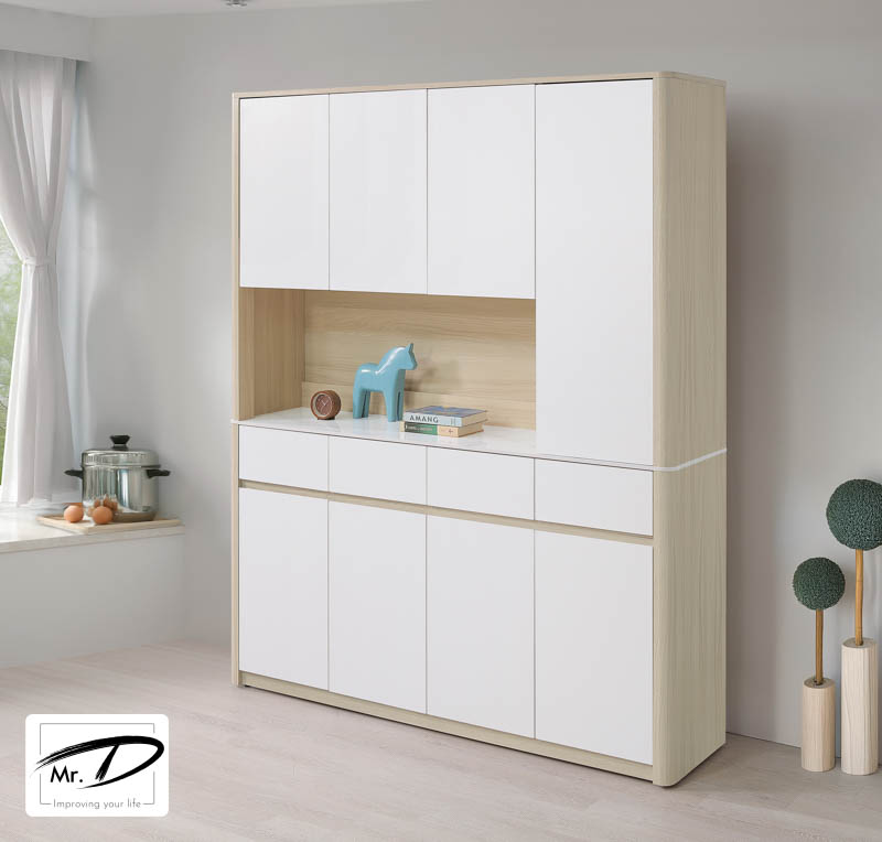 寬160×深40×高200cm 1. A級環保木心板包含抽牆,經立體 木紋耐磨塗裝 2. 桌面採11mm亮面雪山石岩板面, 具耐磨、耐熱特性 3. 採1.0mm系統式ABS封邊 4. 側板採三層木心板圓柱,櫃體採 4cm圓角設計 5. 台灣製造 6. 上下門內皆附一隔板 7.長門內附一固定二活動隔板