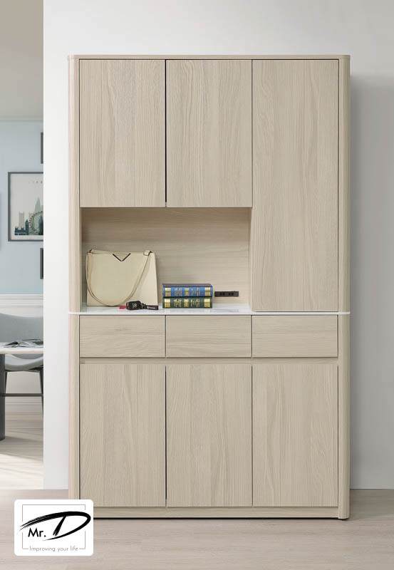 寬120×深40×高200cm 1. A級環保木心板包含抽牆, 經立體木紋耐磨塗裝 2. 桌面採11mm亮面雪山石岩板面, 具耐磨、耐熱特性 3. 採1.0mm系統式ABS封邊 4. 側板採三層木心板圓柱, 櫃體採4cm圓角設計 5. 台灣製造 6. 上下門內皆附一隔板 7. 長門內附一固定二活動隔板