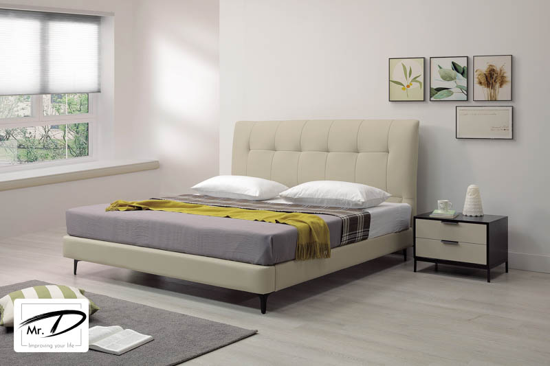 寬186×深203×高115cm 1. 床枕採高級頭層牛皮/ 床架乳膠皮革材質 2. 實木骨架+高密度泡棉 3. 採15cm金屬腳座 4. 採平整式包覆床底
