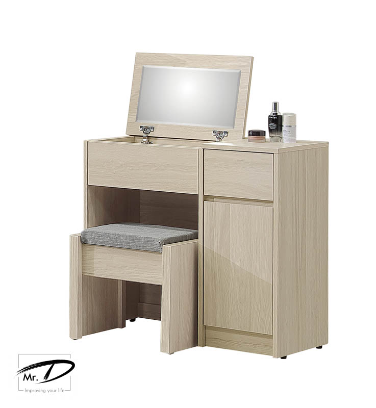 寬80×深40×高77cm 掀鏡台雙暗抽設計 椅墊可掀置物 1. 正面、檯面、側板、抽牆採用台灣製造A級環保木心板 2. 專利技術同調木紋鋼刷壓紋,猶如實木質感 3. 採用系統式1.0mm厚ABS材質封邊處理,質感細緻 延長使用週期,具耐衝擊特 4.抽屜採用台灣製鋼珠滑軌 5. 採系統式斜邊式無把手設計 6. 台灣製造