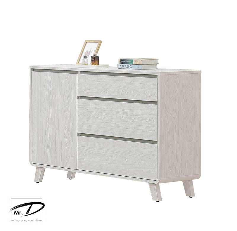 寬120×深40×高83cm (門內附一隔板) 1. 正面、檯面、側板、抽牆採用台灣製造A級環保木心板 2. 底板圓弧採實木噴漆導角 3. 專利技術同調木紋鋼刷壓紋,猶如實木質感 4. 採用系統式1.0mm厚ABS材質封邊處理,延長使用週期,具耐衝擊、高鋼性特質 5. 腳座採高12cm木心板腳座,採同色處理 6. 抽屜採用台灣製鋼珠滑軌 7. 採斜邊式無把手設計 8. 台灣製造