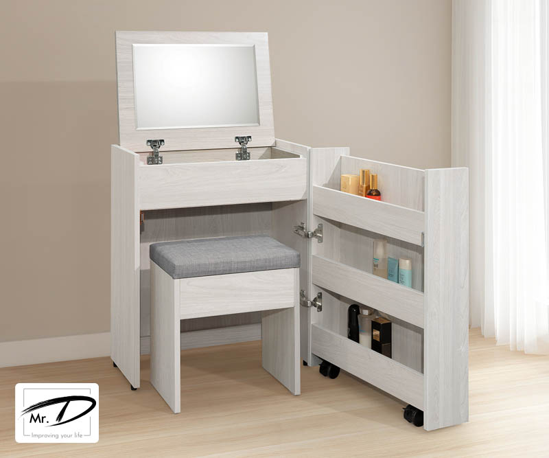 寬60×深45×高75.5cm 椅墊可掀開置物 椅子可直接收進入鏡台 1. 正面、檯面、側板與抽牆採用台灣製造高級環保木心板 2. 桌面採水泥紋美耐皿材質、具耐磨、耐熱特性 3. 專利技術同調木紋鋼刷壓紋,猶如實木質感 4. 採用系統式1.0mm厚ABS材質封邊處理,質感細緻延長使用週期,具環保、耐衝擊、耐磨性、高鋼性特質 5. 腳座採高12cm木心板腳座,同色處理 6. 抽屜採用台灣製鋼珠滑軌,門片採用油壓緩衝鉸鍊 7. 背板採用美背處理 8. 台灣製造