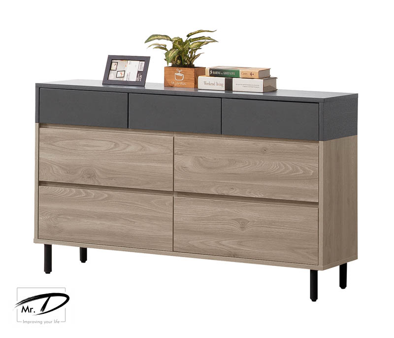寬120×深40×高76cm 1. 正面、檯面、側板與抽牆採用台灣製造A級環保木心板 2. 專利技術同調木紋鋼刷壓紋,猶如實木質感 3. 採用系統式1.0mm厚ABS材質封邊處理,質感細緻延長使用週期,具耐衝擊、耐磨性特質 4. 採高12cm金屬圓腳經烤漆處理 5. 抽屜採用台灣製鋼珠滑軌 6. 台灣製造