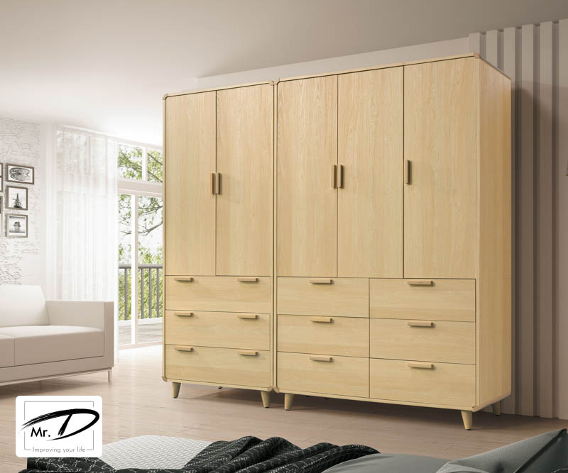 寬202.5×深57×高201.5cm 1. 正面、檯面、側板採用台灣製造A級環保木心板 2. 表面處理採用木紋耐磨,猶如實木質感 3. 櫃體四邊角、腳座與把手採橡膠木實木製,烤漆處理 4. 抽屜採用台灣製鋼珠滑軌,門片採用油壓緩衝鉸鍊 5. 台灣製造