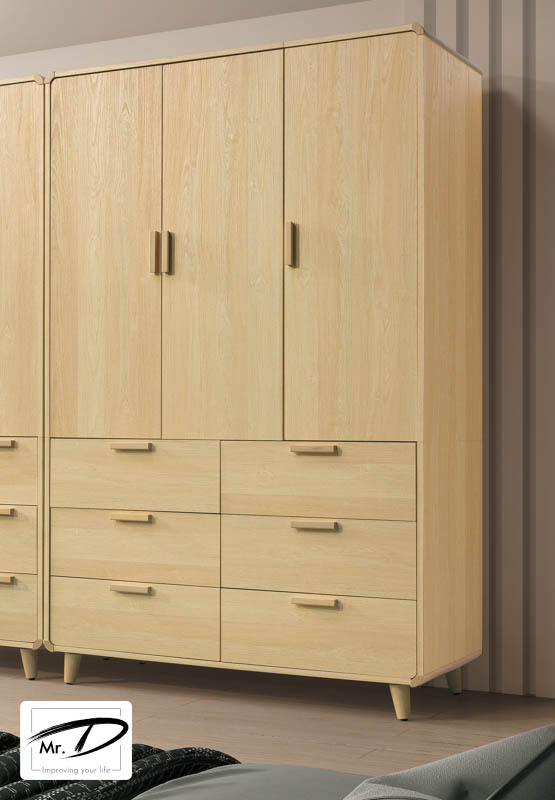 寬120.5×深57×高201.5cm 1. 正面、檯面、側板採用台灣製造A級環保木心板 2. 表面處理採用木紋耐磨,猶如實木質感 3. 櫃體四邊角、腳座與把手採橡膠木實木製,烤漆處理 4. 抽屜採用台灣製鋼珠滑軌,門片採用油壓緩衝鉸鍊 5. 台灣製造