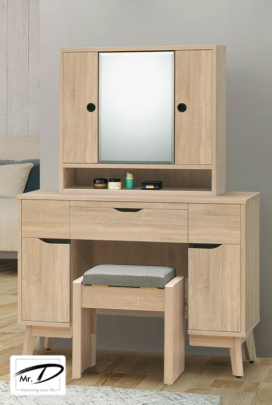 寬100×深40×高140.5cm (附可拉式托盤) (共四開門、三抽屜、一拉櫃,收納大空間) 旋轉式鏡面,內有置物空間 椅墊可掀開置物 1. 正面、檯面、側板、抽牆採用台灣製造A級環保木心板 2. 專利技術同調木紋鋼刷壓紋,猶如實木質感 3. 腳座採12cm高實木腳座,施以桶身相同木紋,整體質感提升 4. 抽屜採用台灣製鋼珠滑軌 5. 台灣製造