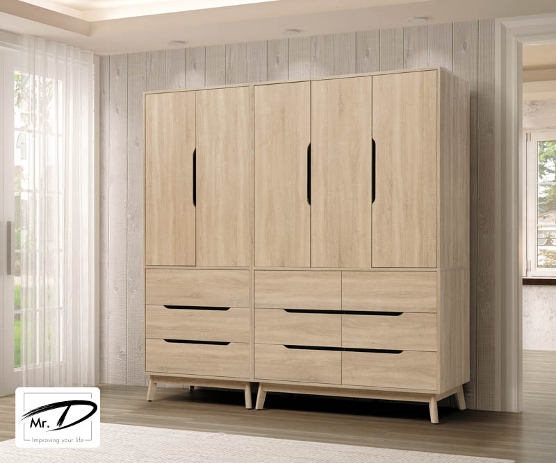 寬200×深58×高201cm 1. 正面、檯面、側板、抽牆採用台灣製造A級環保木心板 2. 腳座採實木腳座,施以桶身相同木紋,整體質感提升 3. 專利技術同調木紋鋼刷壓紋,猶如實木質感 4. 抽屜採用台灣製鋼珠滑軌,門片採用油壓緩衝鉸鍊 5. 背板採用美背處理 6. 台灣製造