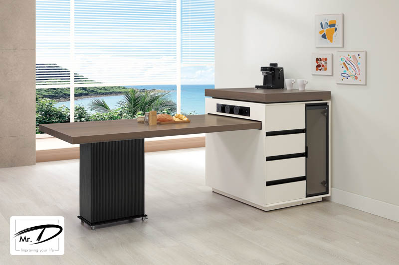 寬210-255×深90×高98cm 島台:寬75×深90×高98cm 桌面:寬140-180×深80×高75cm 1. 環保全實木夾板櫃體 2. 優耐坦烤漆塗裝 3. 雙木紋面為11mm岩板五面全包覆 4. 鋼珠滑軌、緩衝鉸鏈,鋁合金6mm強化玻璃門框 5. 附電器專用快拆插座,避免同時多個使用
