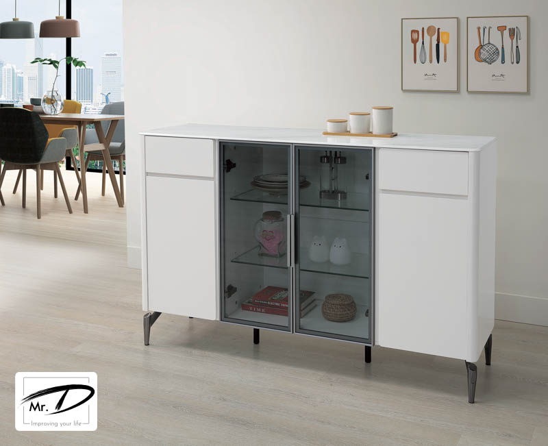 寬140×深39×高90cm 左右門內各一隔板 1. 環保MDF全包覆與抽面實木皮材質 2. 優耐坦耐磨烤漆塗裝 3. 桌面採天然石基底經人工微晶石紋加工處理 4. 6mm強化玻璃、金屬鋁框門 5. 金屬腳架經古銅色處理