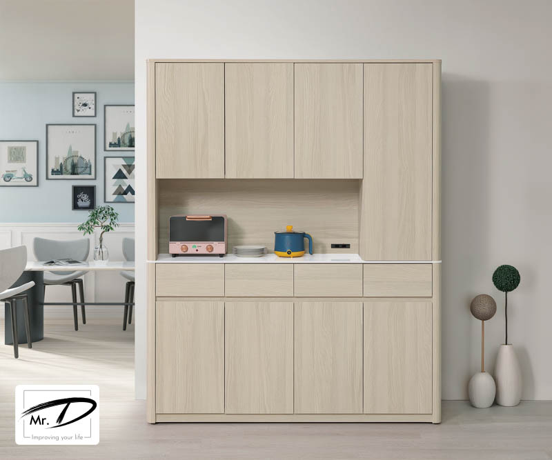 寬160×深40×高200cm 1. A級環保木心板包含抽牆,經立體木紋耐磨塗裝 2. 桌面採11mm亮面雪山石岩板面,具耐磨、耐熱特性 3. 採1.0mm系統式ABS封邊 4. 側板採三層木心板圓柱,櫃體採4cm圓角設計 5. 台灣製造