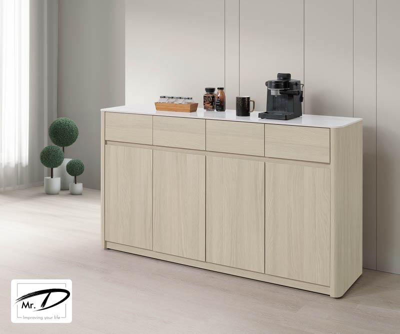 寬160×深40×高90cm 1. A級環保木心板包含抽牆,經立體木紋耐磨塗裝 2. 桌面採11mm亮面雪山石岩板面,具耐磨、耐熱特性 3. 採1.0mm系統式ABS封邊 4. 側板採三層木心板圓柱,櫃體採4cm圓角設計 5. 台灣製造