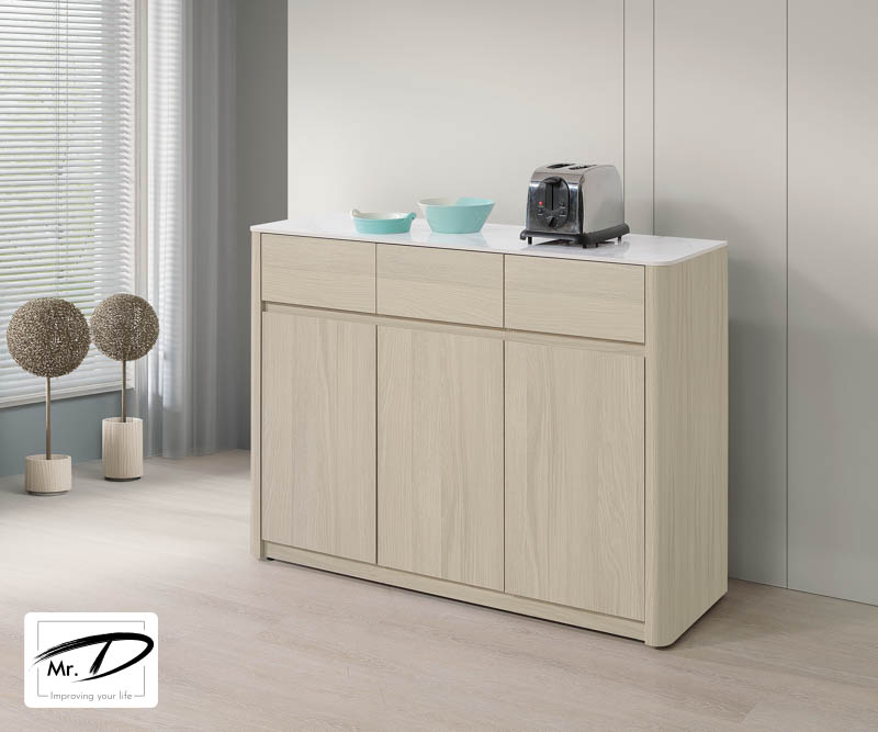 寬120×深40×高90cm 1. A級環保木心板包含抽牆,經立體木紋耐磨塗裝 2. 桌面採11mm亮面雪山石岩板面,具耐磨、耐熱特性 3. 採1.0mm系統式ABS封邊 4. 側板採三層木心板圓柱,櫃體採4cm圓角設計 5. 台灣製造