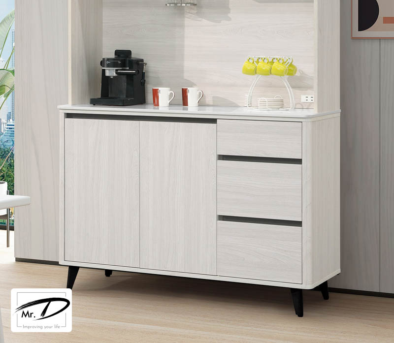 寬120×深40×高83cm 門內附一隔版 1. 環保木心板包含抽牆,經立體木紋耐磨塗裝 2. 桌面採12mm亮面雪山石岩板面,具耐磨、耐熱特性 3. 採1.0mm系統式ABS封邊,櫃體採3cm圓角設計 4. 黑色粉體烤漆金屬腳座 5. 台灣製造