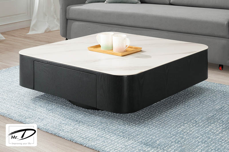 寬90×深90×高30cm 前後共附二抽 1. 高級MDF經實木皮全包覆 2. 優耐坦烤漆耐磨處理 3. 採12mm平光雪山石岩板桌面,具耐熱、耐磨特性 4. 採實木抽牆