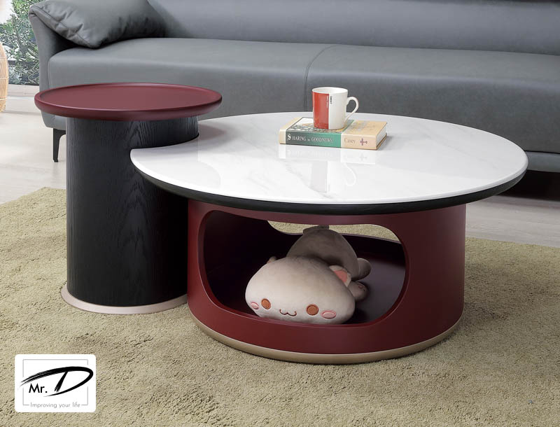 大圓:寬85×深80×高37cm 小圓:寬42×深42×高49cm 大理石檯面置放高溫物品需墊隔熱墊保護檯面 (升高58cm) (全組不可拆賣) 大茶几開放收納,可當寵物空間 小茶几可移動分開使用 小茶几面可升降使用,內有收納 1. 環保MDF全包覆材質 2. 優耐坦耐磨烤漆塗裝 3. 採天然石基材經人工美化波麗漆處理 4. 小茶几實木皮噴漆