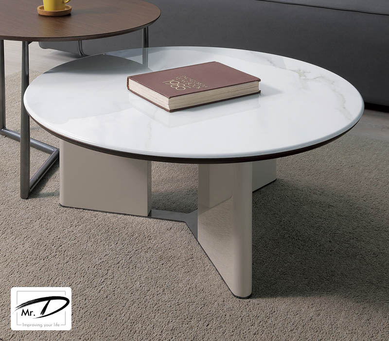 圓80×高37cm 大理石檯面置放高溫物品需墊隔熱墊保護檯面 1. 環保MDF全包覆材質 2. 優耐坦耐磨烤漆塗裝 3. 金屬深古銅色烤漆腳架 4. 大茶几採滿版天然石面基底經人工石紋美化表面處理