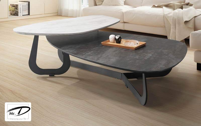 大茶几:寬132×深93×高30cm 小茶几:寬108×深48×高39cm (大小茶几為固定式組合、不可拆開使用) 1. 採義大利5.5mm陶板桌面貼合滿版木底板,斜邊倒角,具高強度、耐熱、好清理 2. 實心金屬鐵片腳座經黑色粉體烤漆
