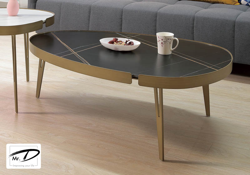寬110×深71×高38cm 1. 採12mm岩板桌面,具耐磨、耐熱特性 2. 金屬腳座採古銅金色塗裝處理