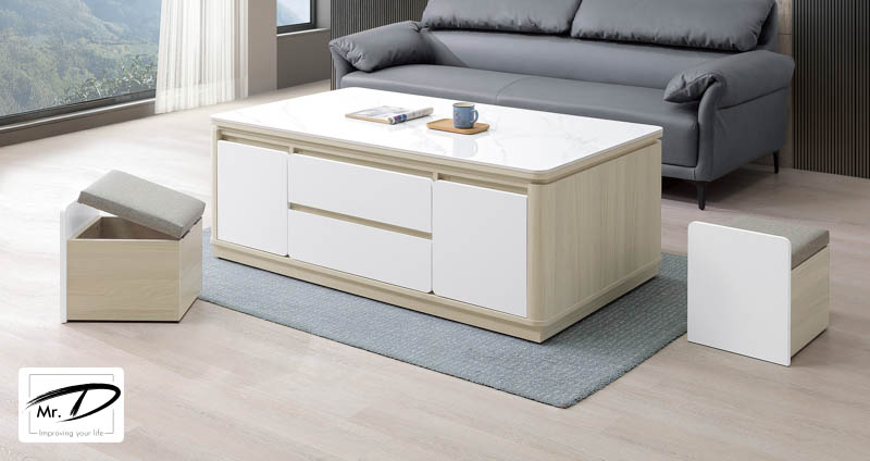 寬140×深80×高55cm (含二椅凳,可全收進茶几) 正面二抽,雙面共四門 二椅凳可收進茶几背面 採3.5cm圓弧安全角造型 1. A級環保木心板包含抽牆,經立體木紋耐磨塗裝 2. 桌面採12mm亮面雪山石岩板面 3. 採1.0mm系統式ABS封邊 4. 台灣製造