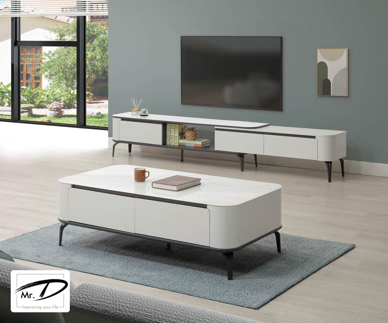 寬188×深36×高46cm (伸縮:188~285cm) 1. 環保MDF全包覆材質 2. 優耐坦耐磨烤漆塗裝 3. 金屬腳架經深色烤漆塗裝 4. 桌面採超晶石紋烤漆強化玻璃