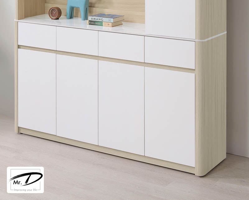 寬160×深40×高90cm 1. A級環保木心板包含抽牆,經立體木紋耐磨塗裝 2. 桌面採11mm亮面雪山石岩板面,具耐磨、耐熱特性 3. 採1.0mm系統式ABS封邊 4. 側板採三層木心板圓柱,櫃體採4cm圓角設計 5. 台灣製造