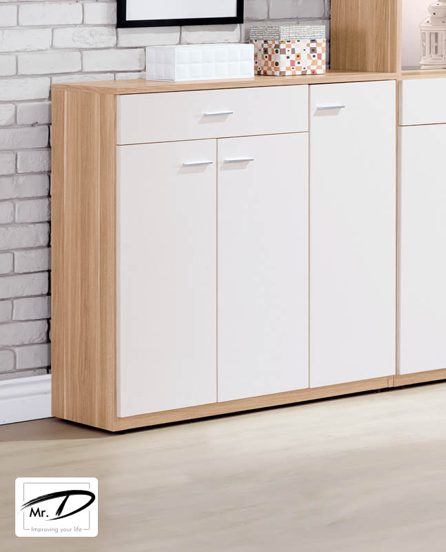 寬90×深32×高92cm 1. 正面木心板材質,PVC耐磨塗裝 2. 檯面、側板木心板材質,耐磨塗裝木紋經特殊立體處理 3. 亮面金屬把手,5mm鏡面 4. 抽屜採用鋼珠滑軌、門片採油壓式鉸鍊 5. 台灣製造