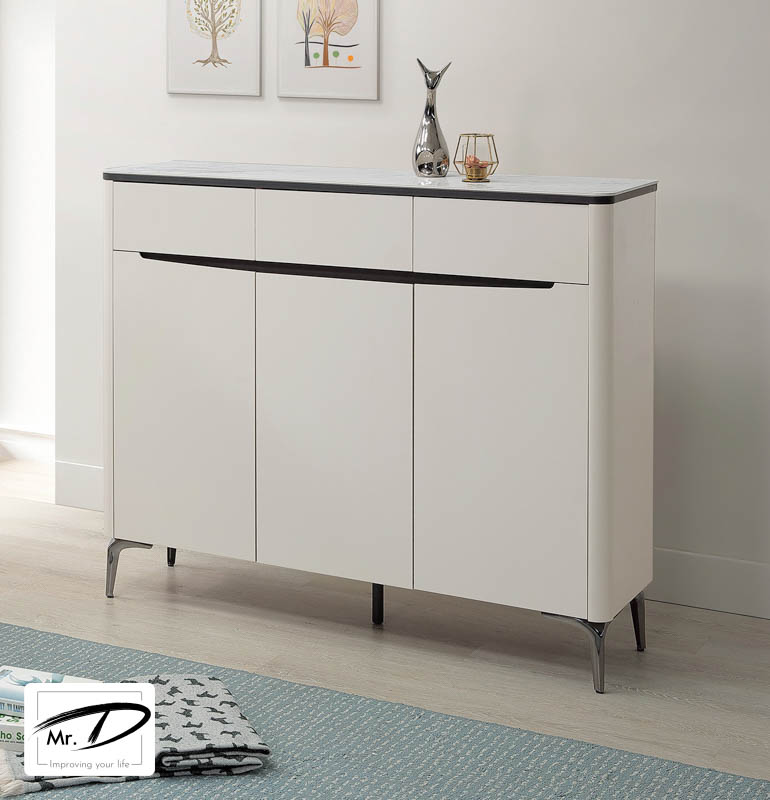 寬120×深34×高102cm 附三大三小活動隔板 1. 環保MDF全包覆材質 2. 優耐坦烤漆塗裝 3. 桌面6mm岩板面 4. 鋼珠滑軌、緩衝鉸鍊 5. 高15cm深古銅色烤漆腳