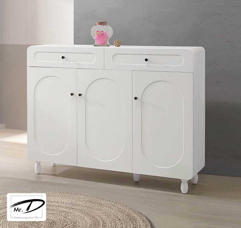 寬120×深34.5×高94cm 附三大三小活動隔板 1. 環保MDF全包覆材質 2. 優耐坦烤漆塗裝 3. 鋼珠滑軌、緩衝鉸鏈 4. 高12cm實木烤漆腳