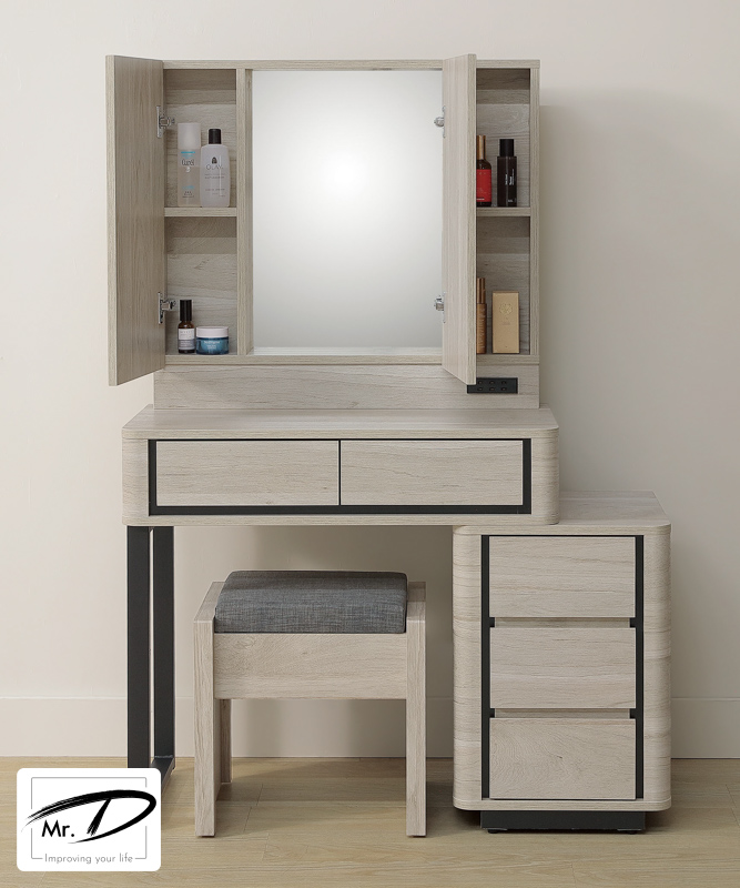 寬80×深40×高144cm_x000D_ 側櫃:寬40×深40×高57.5cm (鐵腳與側櫃可左右自由擺放) 1. 正面、檯面、側板、抽牆採用台灣製造A級環保木心板,_x000D_ 專利技術同調木紋鋼刷壓紋,猶如實木質感_x000D_ 2. 櫃體採3.5cm圓弧造型,美觀又安全_x000D_ 3. 採系統式斜邊無把手設計_x000D_ 4. 採用系統式1.0mm厚ABS材質封邊處理,質感細緻_x000D_ 延長使用週期,具耐衝擊、高鋼性特質_x000D_ 5. 抽屜採用全拉三節式鋼珠滑軌 6. 台灣製造 開門式隱藏鏡面 上座附安全插座 椅墊可掀開置物