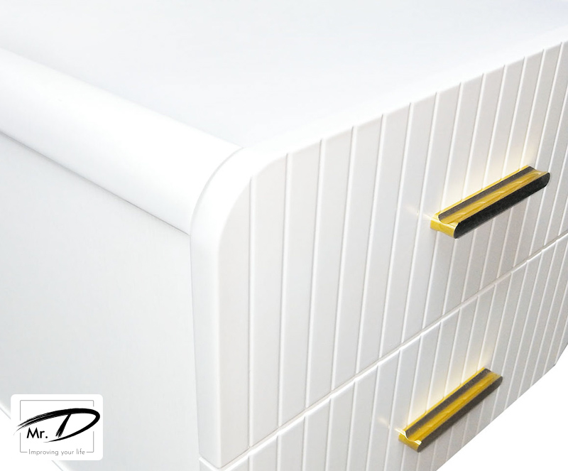 寬48×深40×高48cm 1. 正面採MDF材質經CNC雕刻,白色烤漆全包覆處理_x000D_ 2. 檯面、側板與抽牆採用台灣製造高級環保木心板_x000D_ 3. 專利技術同調木紋鋼刷壓紋,猶如實木質感_x000D_ 4. 採用系統式1.0mm厚ABS材質封邊處理,質感細緻_x000D_ 延長使用週期,具環保、耐衝擊、耐磨性、高鋼性特質 5. 高12cm金屬腳,腳座及把手_x000D_ 為亮金色電鍍處理_x000D_ 6. 抽屜採用台灣製鋼珠滑軌 7. 台灣製造